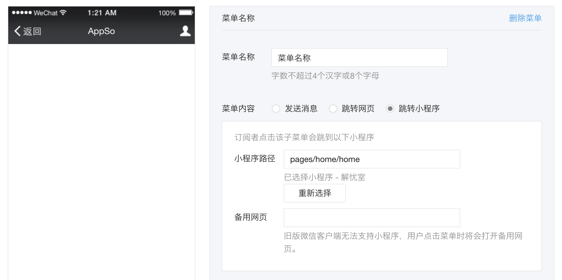 2、公众号菜单栏支持小程序直接跳转