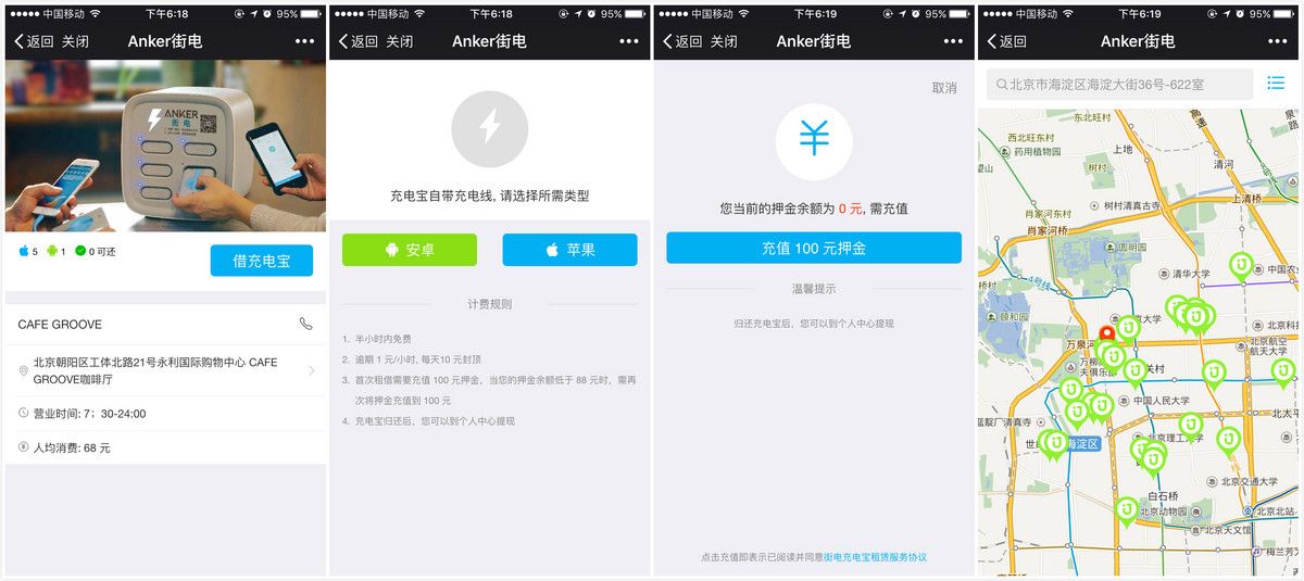 微信公众号或APP客户端:这是用户进行操作的客户端,通常为微信公众号,部分产品有APP,实现的功能都类似,主要有充电宝的借还流程、费用支付、押金支付提款。