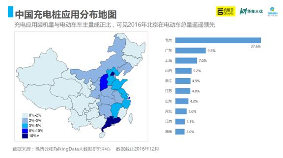 充电桩应用装机量与电动车车主量成正比,2016年北京市在电动车保有总量上遥遥领先。