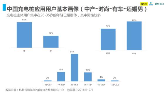 中国充电桩应用用户集中在26-35岁年轻已婚群体,男性偏多。