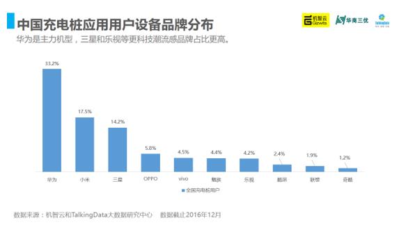 中国充电桩应用用户3成是华为控,三星和乐视等更高科技潮流感品牌占比更高。