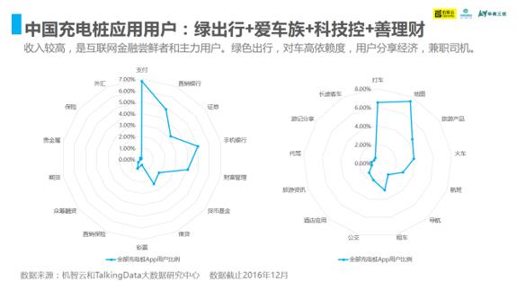 中国充电桩应用用户收入较高,是互联网金融的尝鲜者和主力用户。崇尚绿色出行,对车的依赖度高,经常打车,并兼职做司机,是分享经济的先行者。