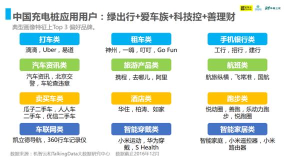 中国充电桩应用用户偏好的Top3打车类品牌是滴滴、Uber、易道;Top3租车类品牌是神州、一嗨、叮叮;Top3手机银行类品牌是工商银行、招商银行、建设银行;Top3汽车资讯类品牌是凄恻资讯、北京交警、车轮查违章;Top3旅游类品牌是携程、去哪儿、阿里;Top3航班类品牌是航旅纵横、飞常准、国航;Top3买卖车类品牌是瓜子二手车、人人车、优信二手车;Top3酒店类品牌是华住、柏涛、如家;Top3跑步类品牌是悦动圈、善跑、乐动力;Top3智能穿戴类品牌是小米运动、华为可穿戴、三星S-Health;Top3智能家居类品牌是智能家庭、小米遥控器、小米路由器等。