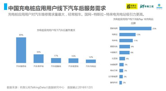 中国充电桩应用用户在汽车后服务中,对汽车维修的需求量最大,也经常租车。经常光临的线下充电站是国网~特斯拉和特来电。