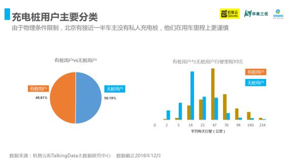 由于物理条件限制,北京有接近一半车主没有私人充电桩,他们在用车里程上更谨慎,日平均里程数更少。