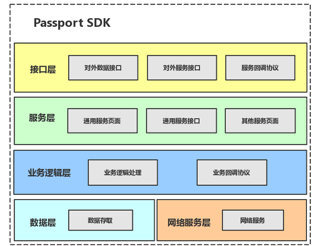 业务逻辑层处理服务层发起的业务事件,通过网络服务层发起对应的网络请求,数据层进行数据存取:“账户登录”的业务事件会首先跟 Passport 服务端通信,得到通信结果后处理数据,返回结果给账户登录服务页面。