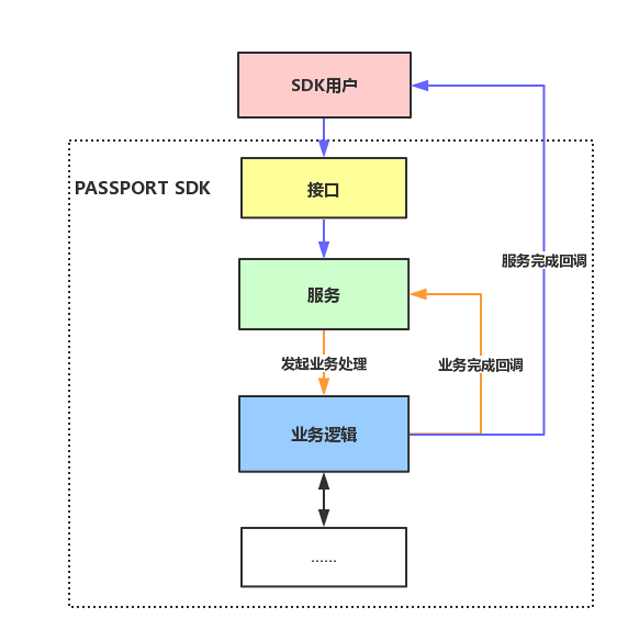 Passport 的服务可以看作是一个环形,由用户发起,在用户结束,中间有一次或多次的业务事件处理,且无需对用户暴露,所以 Passport 服务的处理过程实际上是一个黑盒——用户调起服务后,只有在出现成功或失败的结果后,他们才会收到服务完成的回调,其他的事件都在 Passport SDK 内部处理,用户只需要调起服务,等待响应服务结果即可。