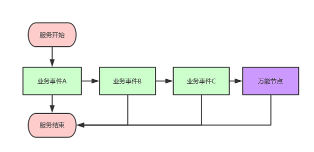 如图 5 所示,在服务的流程中,每个业务事件都是一个节点,而这些节点串联起来就形成了整个服务。业务事件的处理结果决定有没有下一个服务页面以及下一个服务页面是什么。所以根据服务端的灵活配置,可以对某个服务的流程进行实时变更,使服务更加贴合实际的需求。