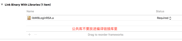 SDK 须尽量避免使用公共库,如果使用,公用库也应该作为外链文件存在,不要编译进静态库中,以避免与使用者的工程冲突(见图 9)。